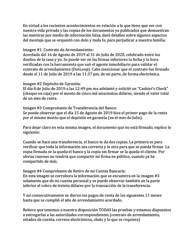 Insistió que tiene a su disposición todas las pruebas “y estamos dispuestos a entregarlas a las autoridades correspondientes (contrato de arrendamiento, estados de cuenta, correos electrónicos, chats y lo que se requiera)”.