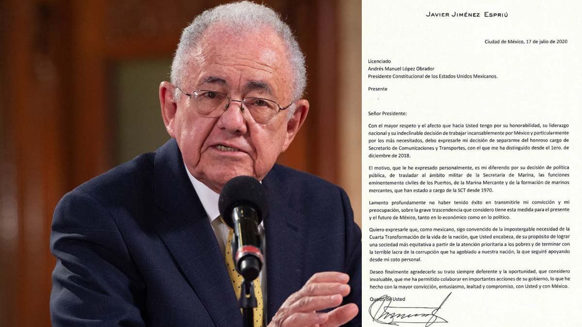 Javier Jiménez Espriú presentó su renuncia a través de una carta dirigida a López Obrador. El ahora exsecretario señala en la misiva diferencias con el Ejecutivo federal sobre el traslado de funciones de la SCT en las aduanas al ámbito militar de la Secretaría de Marina: