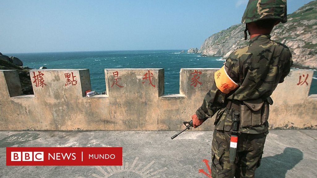 Fuente de la imagen, Getty Images Pie de foto, Soldados taiwaneses apuntan un cañón hacia China en la isla de Matsu.