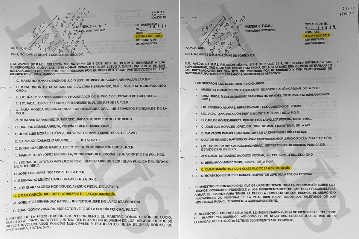 Documentos de la Secretaría de la Defensa sitúan a Omar García Harfuch en Iguala (Guerrero) el 7 y 8 de octubre de 2014, en las primeras reuniones conocidas entre autoridades federales y estatales por el caso Ayotzinapa. García Harfuch ocupaba entonces un puesto de comisario en la división de Gendarmería de la Policía Federal. Antes había dirigido la Federal en Guerrero. García Harfuch no ha querido hacer comentarios a este diario sobre estos documentos. Cuestionado por su papel en el caso estos años, el actual jefe de policía de Ciudad de México ha repetido en varias ocasiones que para cuando ocurrió el ataque contra los estudiantes normalistas, él había dejado Guerrero y “ya estaba en Michoacán”.