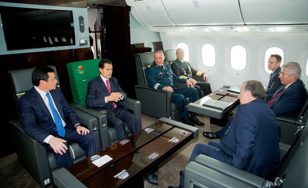 Enrique Peña Nieto, en el avión presidencial junto a varios secretarios, entre ellos Salvador Cienfuegos. Presidencia / Presidencia