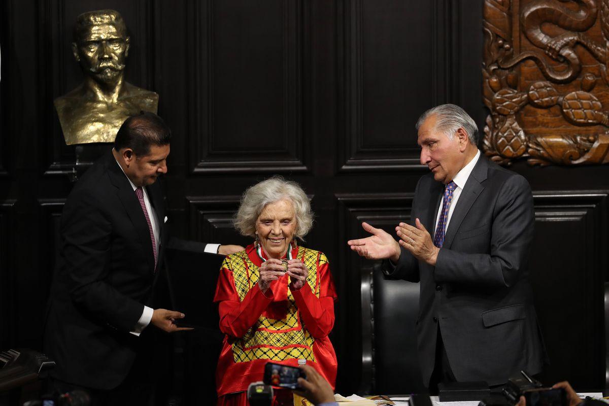 El presidente de la mesa directiva del Senado de la República, Alejandro Armenta, junto al secretario de Gobernación, Adán Augusto López, entrega a la escritora Elena Poniatowska la Medalla Belisario Domínguez. Sáshenka Gutiérrez (EFE)