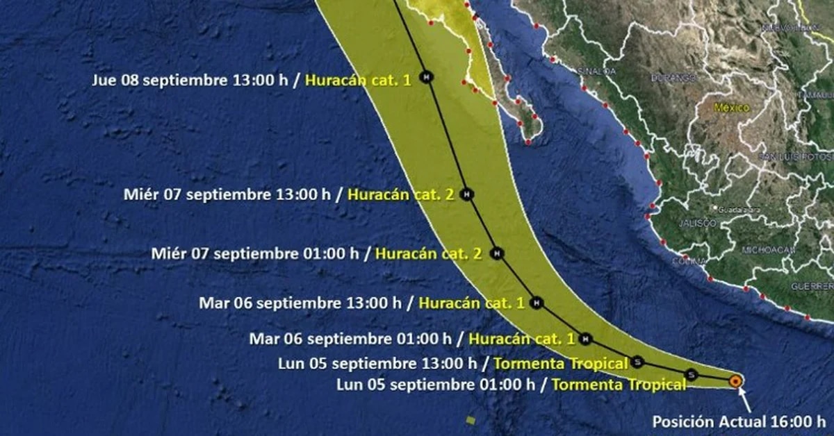 Para final de semana se espera que toque tierra en Baja California Sur y Baja California, sin embargo desde este lunes crecerá su poder lo que ocasionará lluvias intensas, deslaves e inundaciones en varios estados del Pacífico (SMN)