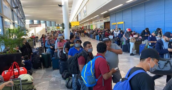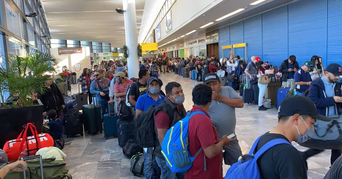 Al interior de la terminal aérea de Tijuana, decenas de familias se veían formados en una fila, también interminable. Algunos sentados sobre maletas y los niños durmiendo hasta en el piso. Los pasajeros se encontraban molestos y fastidiados de estar hasta por 10 horas e incluso por haber perdido su vuelo al ser cancelado por la aerolínea; sin poder llegar a sus destinos.