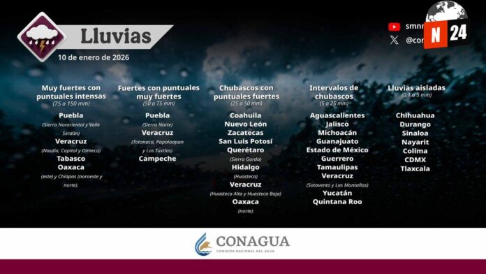 El fenómeno se extenderá con lluvias muy fuertes en la Sierra Norte de Puebla, la región Totonaca de Veracruz y Campeche. Mientras tanto, San Luis Potosí, Querétaro, Hidalgo y el norte de Oaxaca experimentarán lluvias fuertes.