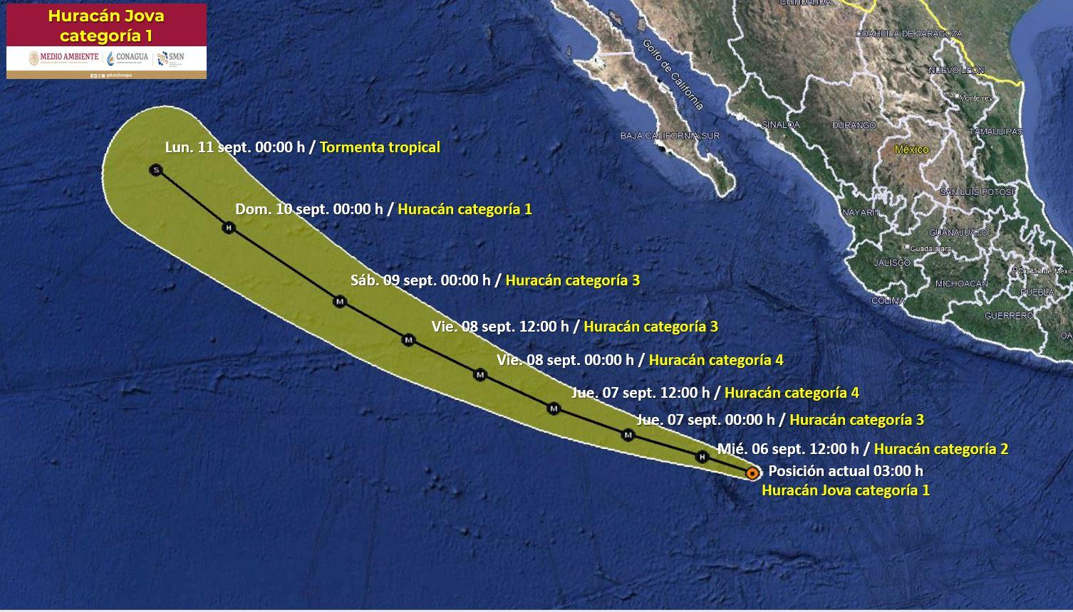 Estas condiciones empeorarán de este miércoles al sábado, ya que se prevé que Jova se intensifique a categoría 2 este mismo día, a categoría 3 este jueves (huracán mayor), a categoría 4 también el jueves y a partir del viernes comenzará a reducir su fuerza.