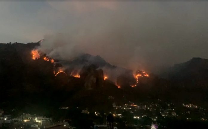 Autoridades de la Comisión Nacional Forestal (Conafor) y de Protección Civil de Morelos trabajan para sofocar un incendio forestal que se registró desde la tarde de este martes en la zona del cerro del Tepozteco, en Tepoztlán, en el estado de Morelos.