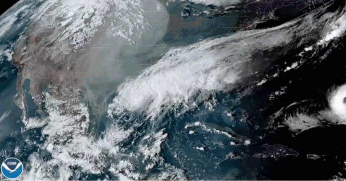 En la parte superior de la imagen se observa a la tormenta tropical Beta, mientras que en la inferior se aprecia el canal de baja presión con el que interactuará a lo largo del día, generando lluvias muy fuertes en cuatro estados (GIF: NOAA)