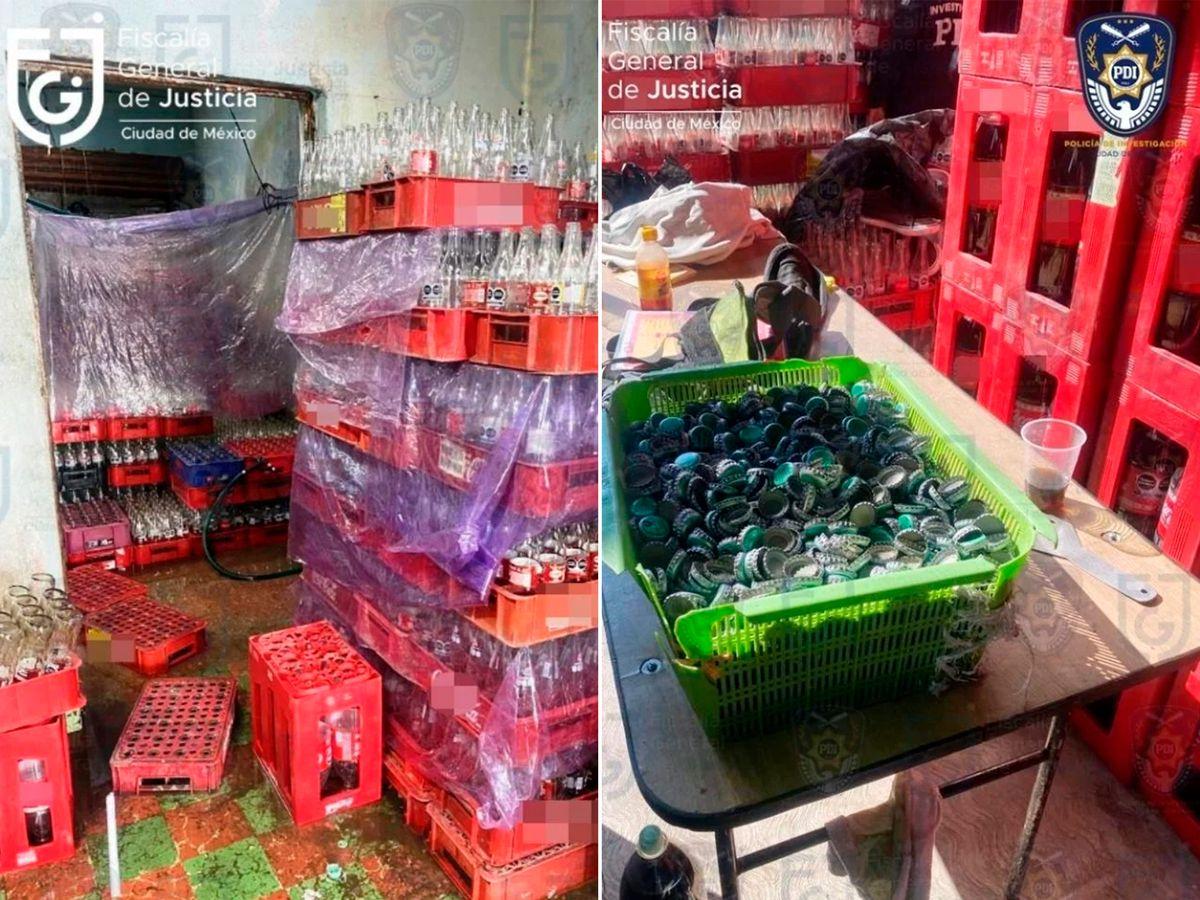 Botellas vacías y corcholatas en la fábrica clandestina de Coca Cola en Iztapalapa, en Ciudad de México. Fiscalía General de Justicia