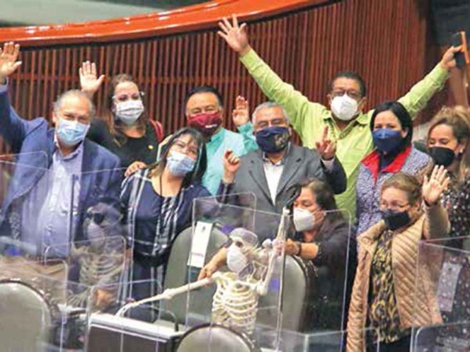 Previo al inicio de la sesión, diputados de Morena colocaron en una curul un esqueleto con cubrebocas.