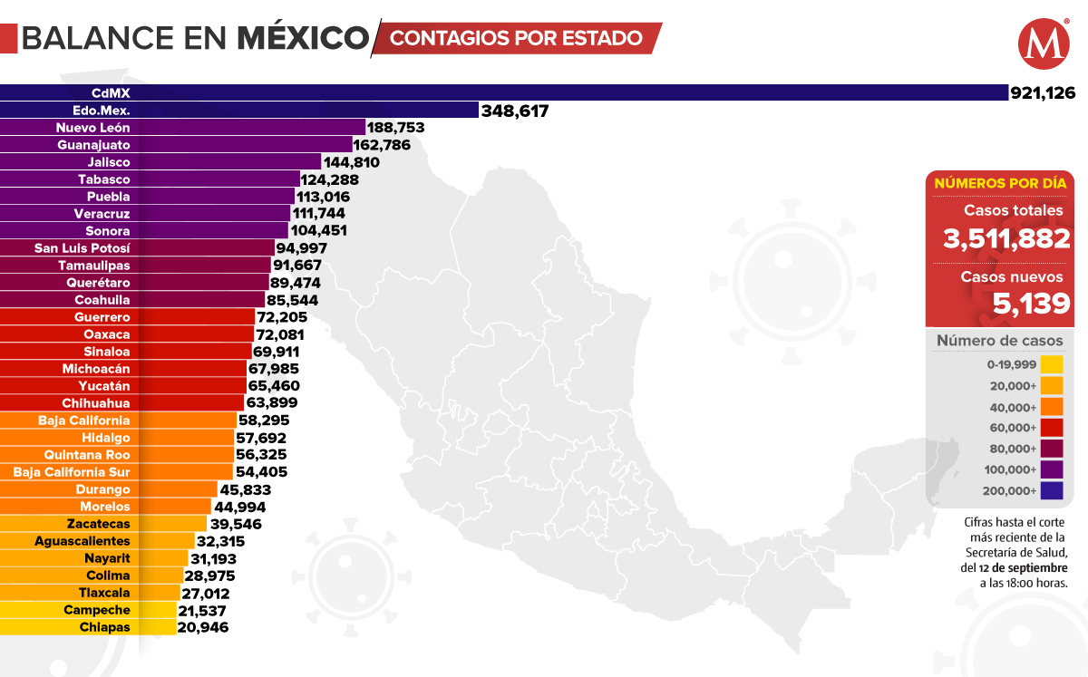 En contagios por estado, la Ciudad de México registra un total de 921 mil 126, siendo la entidad con más casos hasta el momento, seguido del Estado de México con 348 mil 617, Nuevo León con 188 mil 753 y Guanajuato en cuarto lugar con 162 mil 786.