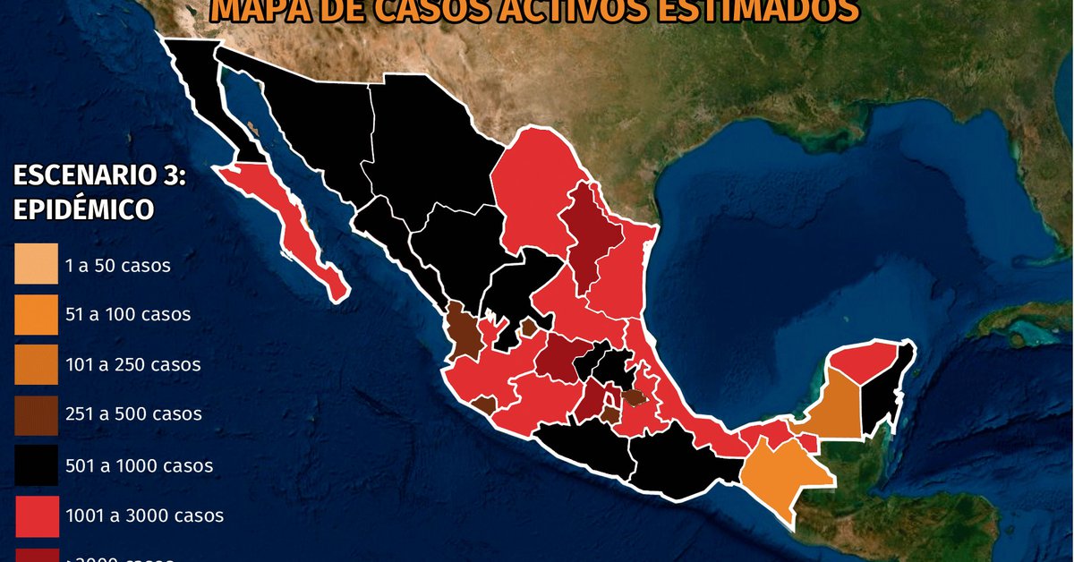 El 7% del total de casos estimados representa la epidemia activa del país, es decir, 43,237 personas han presentado síntomas de coronavirus en los últimos 14 días, siendo la Ciudad de México (CDMX) la entidad con mayor número de casos activos, seguida de Nuevo León, Guanajuato, Estado de México, Jalisco, Coahuila, Yucatán y Puebla como las entidades con más de 1,000 casos activos y que en conjunto concentran el 57.9% de los casos activos del país.