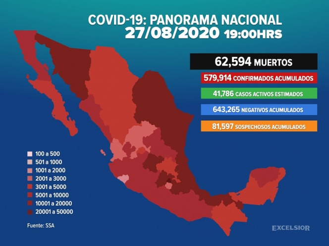 Autoridades de la Secretaría de Salud informaron este día que el número de muertos por coronavirus en México llegó a 62 mil 594, mientras que los casos confirmados alcanzan los 579 mil 914.
