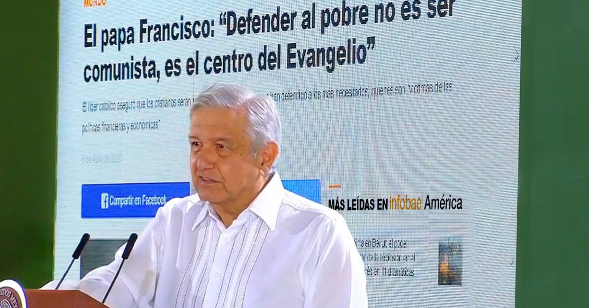 “Es increíble cómo los manipulan, por eso tuve que poner -además, es muy acertada- la frase del papa, defender a los pobres. No es comunismo, es el centro del Evangelio. Es como para decirles a los hipócritas ‘tengan, para que aprendan’”, concluyó el mandatario mexicano.