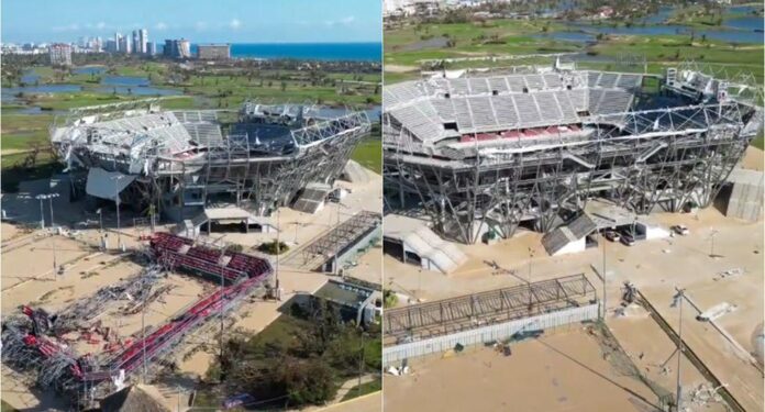 Así quedó la Arena GNP, casa del Abierto Mexicano, luego del paso del Huracán Otis por Acapulco.