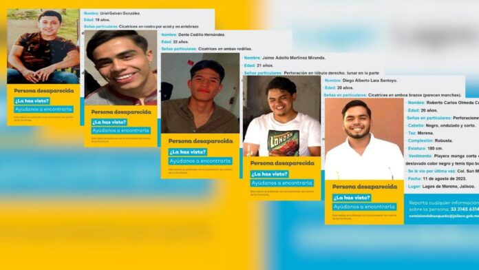 El sábado 12 de agosto, cinco jóvenes fueron reportados como desaparecidos en Lagos de Moreno, Jalisco. Según las investigaciones, los jóvenes se reunieron antes de desaparecer en un lugar turístico conocido como el Mirador de la Santa Cruz. Ahí, la Policía Investigadora encontró restos de sangre y algunos cinchos, según el fiscal general del estado, Luis Joaquín Méndez Ruiz.