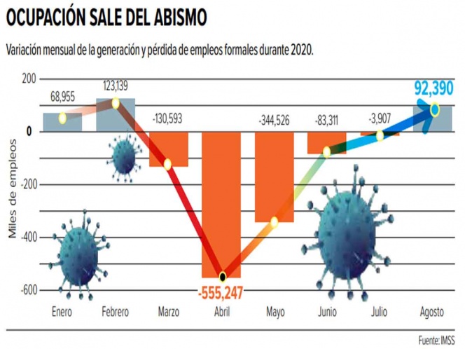 De acuerdo con cifras del propio instituto, en marzo se perdieron 130 mil 593 puestos formales; en abril, 555 mil 247; en mayo, 344 mil 526; en junio, 83 mil 311 y tres mil 907 en julio.