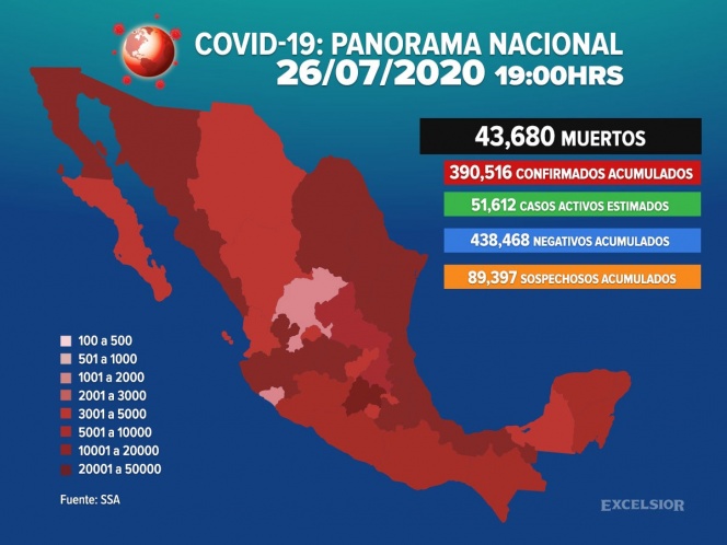 Autoridades de la Secretaría de Salud informaron este día que el número de muertos por coronavirus en México llegó a 43 mil 680, mientras que los casos confirmados alcanzan los 390 mil 516.
