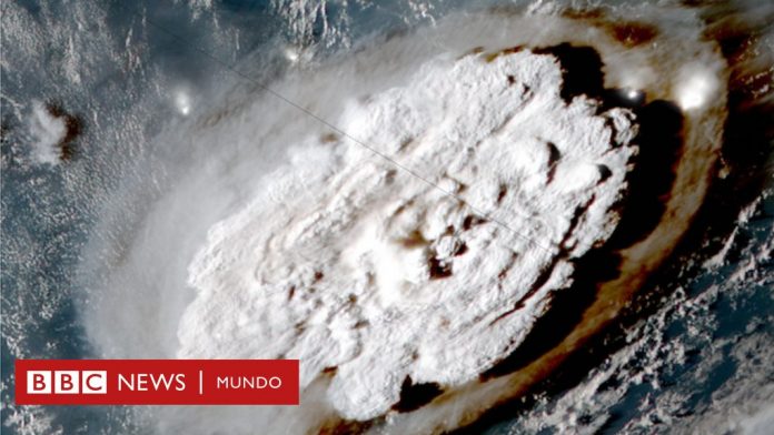 Fuente de la imagen, NOAA Pie de foto, La erupción del volcán submarino de Tonga Hunga Tonga-Hunga Haʻapai se ha visto desde el espacio.