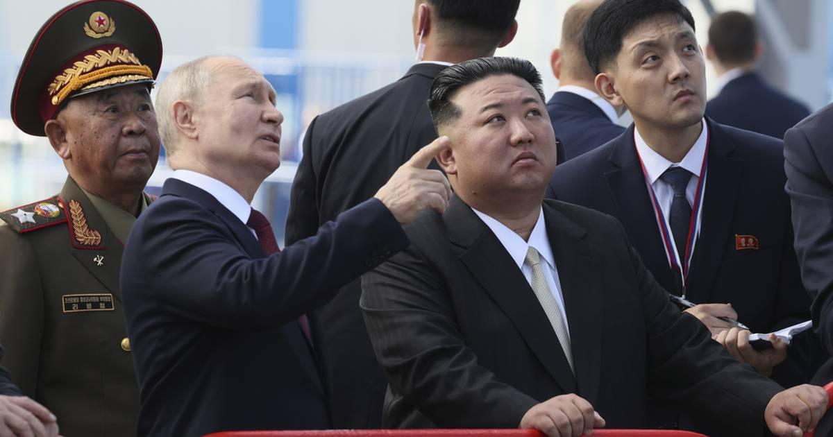 El presidente de Rusia, Vladimir Putin, y el líder de Corea del Norte, Kim Jong Un, examinan una plataforma de lanzamiento aeroespacial. (Mikhail Metzel/AP)