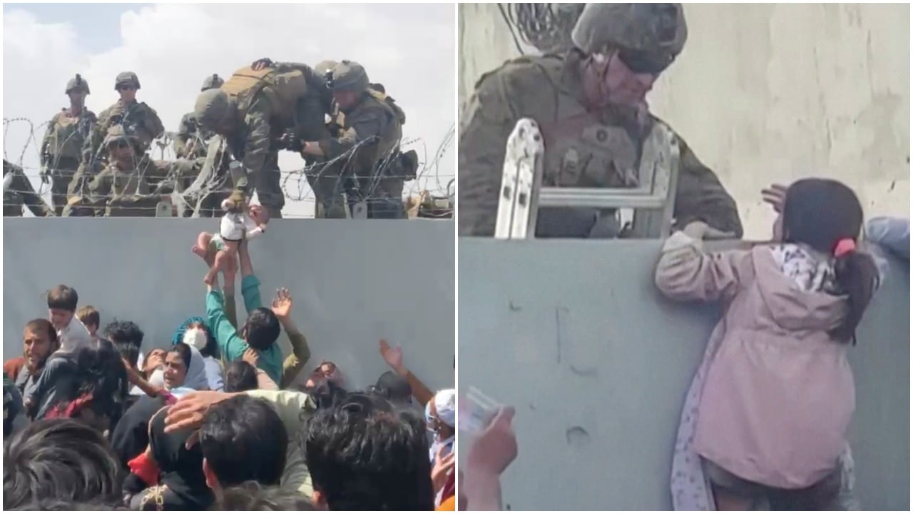 De entre la marea de personas apostadas fuera del aeropuerto del Kabul, una niña pequeña es levantada sobre un enorme muro de seguridad y entregada a los brazos de un soldado estadounidense.: Mujeres afganas comparten su terror ante el regreso del Talibán al poder