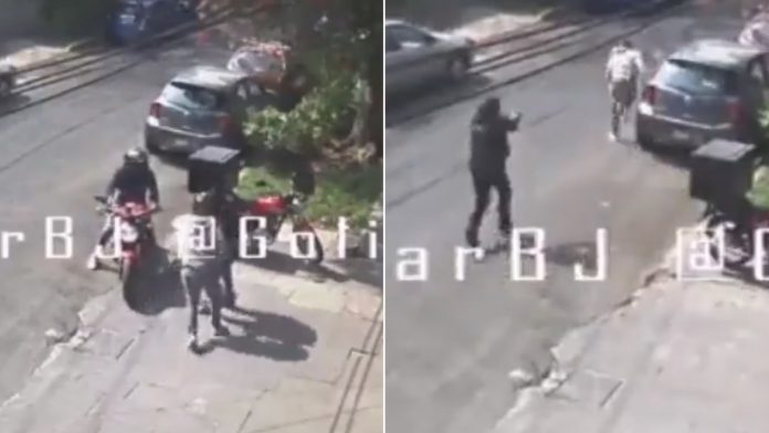 Elementos de la policía bancaria evitaron que un repartidor fuera asaltado en calles de la Colonia Portales, en la #CDMX; todo quedó grabado gracias a una cámara de seguridad pic.twitter.com/w5Vpdvij79