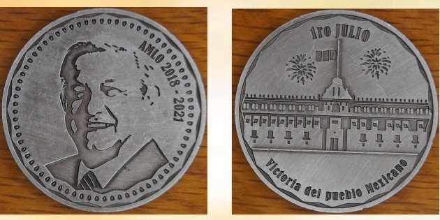 La Acuñadora Emiliano Zapata, empresa nacional en defensa de los metales locales y la actual administración de la 4T como se describen en redes sociales, ha emitido una serie de monedas conmemorativas “en celebración de 3 años de la victoria del pueblo mexicano”, donde se observa el rostro de AMLO en el anverso y en el reverso la imagen del Palacio Nacional, con pirotecnia, y la leyenda: “1ro. de julio. Victoria del pueblo mexicano”. Tiene 40 mm de diámetro y 3 mm de ancho y está hecha de acero, níquel y una aleación de zinc.